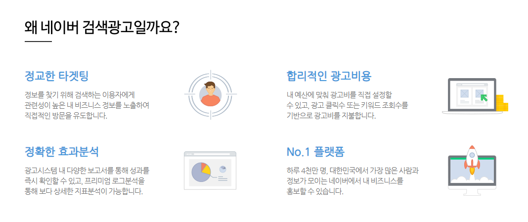 네이버 검색결과 페이지 상단이나 하단에 광고가 노출이 되며, 등록된 키워드와 일치하거나, 연관된 키워드를 입력한 사용자들에게 광고가 보여지며, 노출된 광고를 클릭하면 광고주가 설정한 웹사이트로 이동하게 됩니다. 광고주는 키워드에 따라 광고가 노출되는 위치와 시간대를 설정할 수 있습니다.